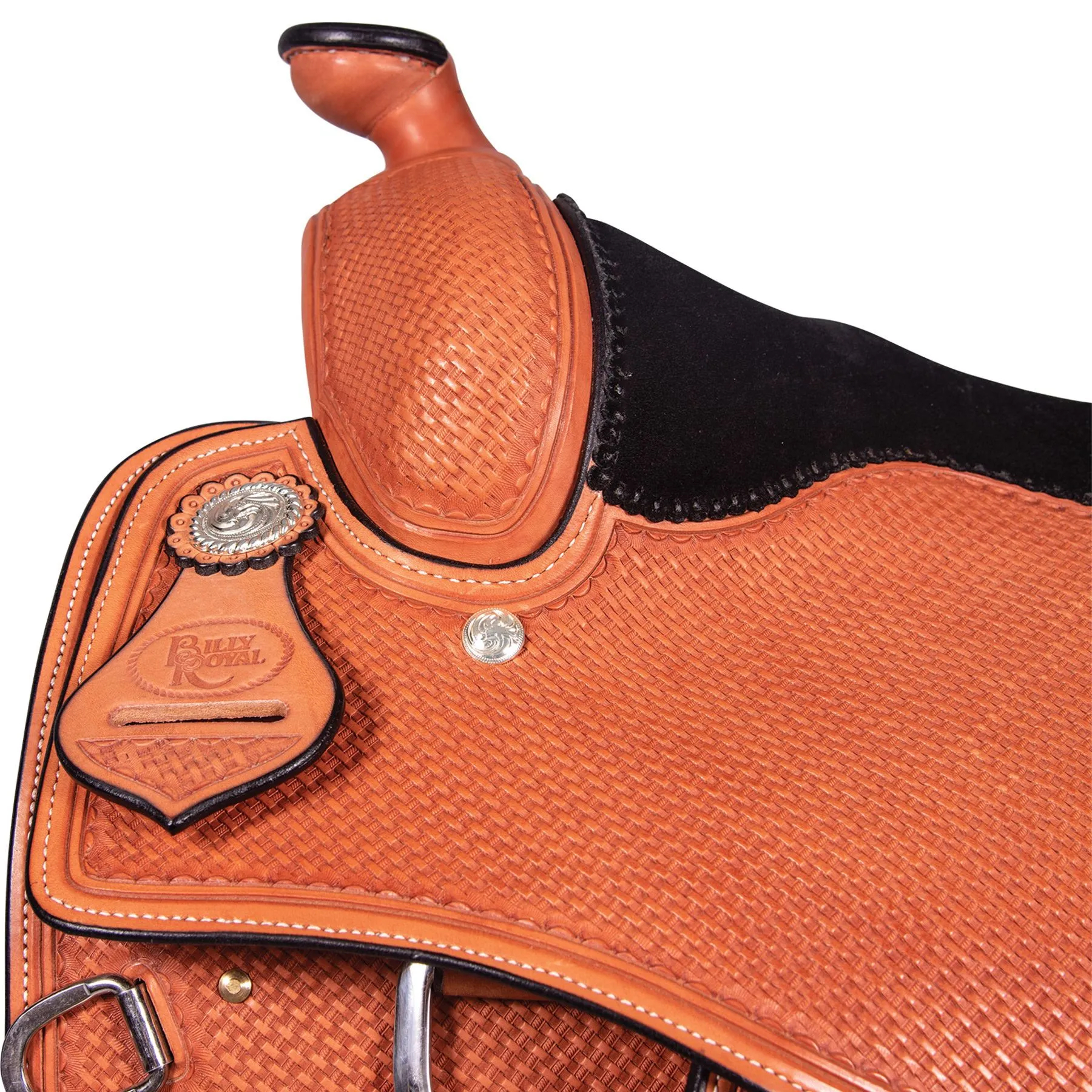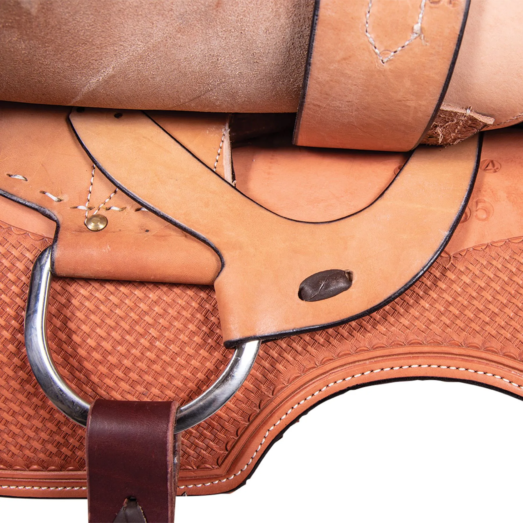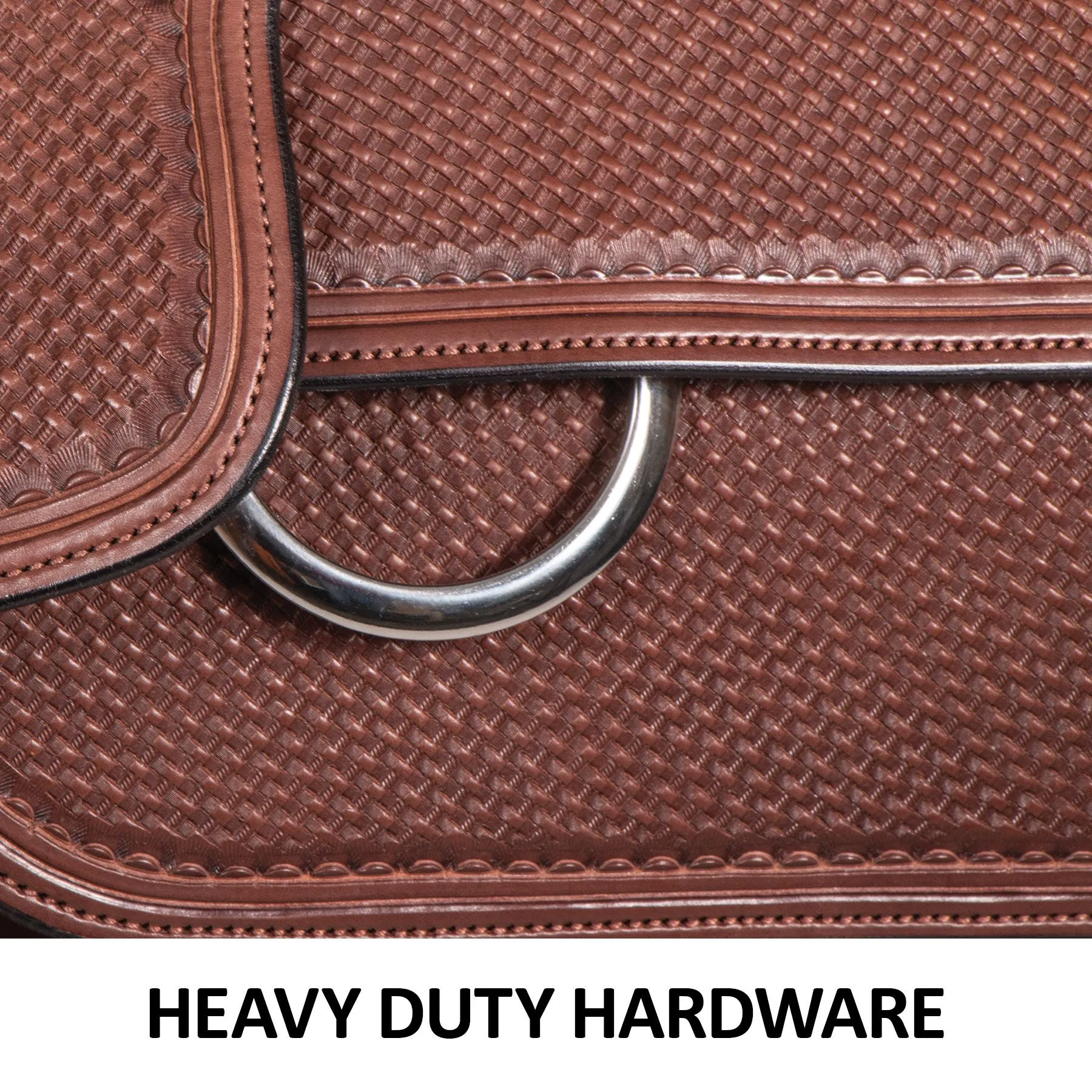 The Basketweave Square Skirt Western Work Saddle is durable and elegant, perfect for everyday use, and suitable for the show ring. The leather has a hand-tooled basketweave pattern that looks lovely and intricate. This saddle is built on custom-made wooden trees and is designed to fit various horses. Its top-tier craftsmanship, thoughtful design, and functional elegance make it an excellent choice for enhancing your riding experience, whether working or showing.