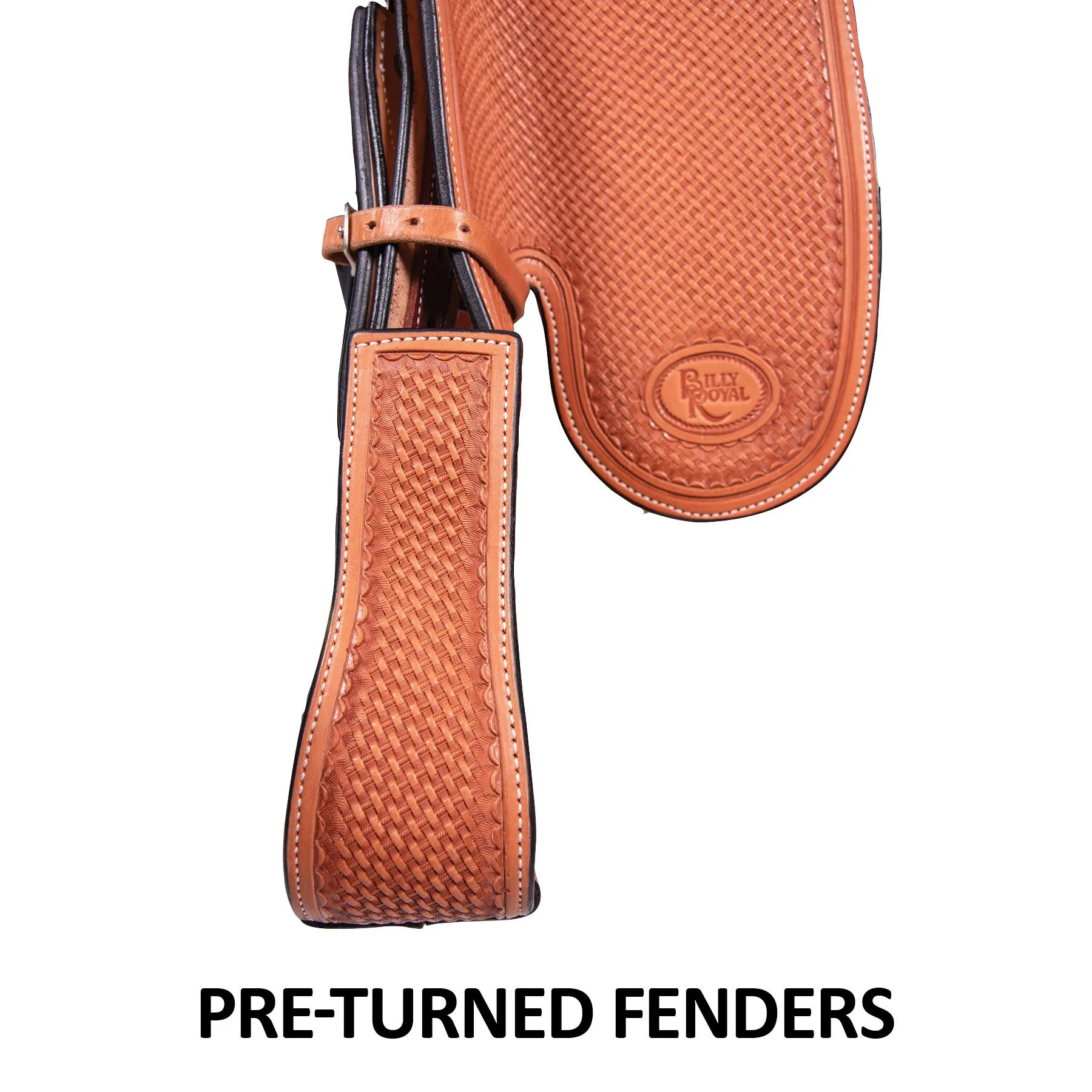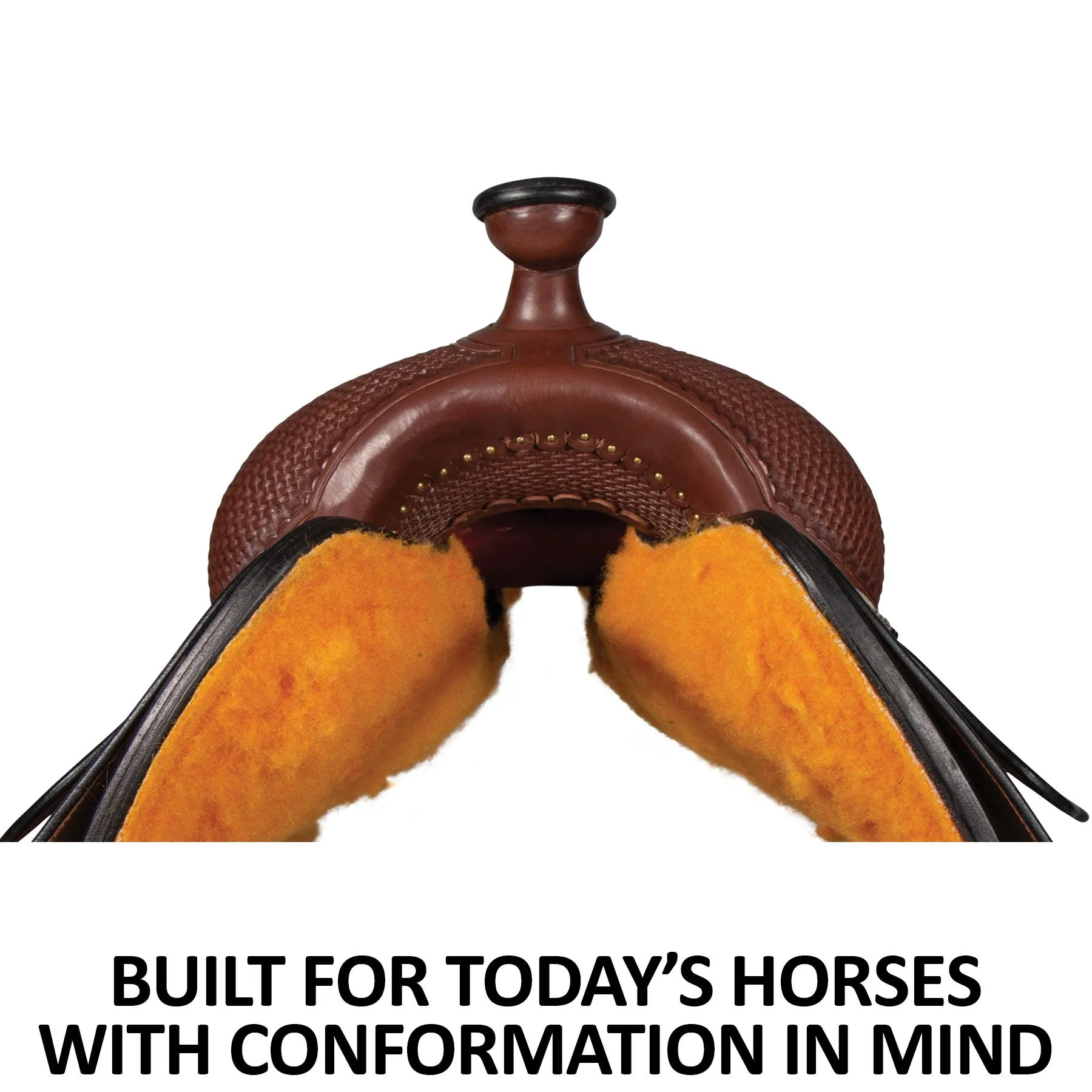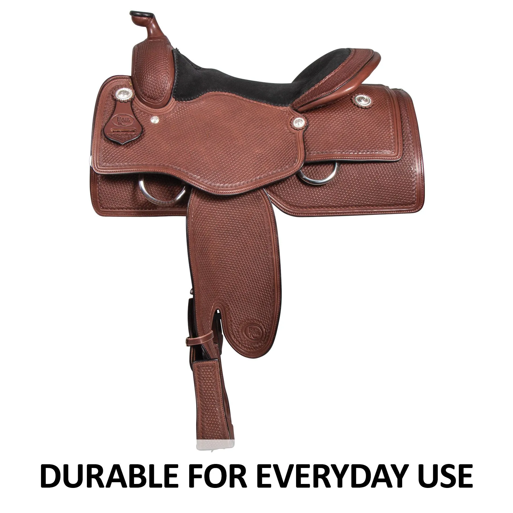The Basketweave Square Skirt Western Work Saddle is durable and elegant, perfect for everyday use, and suitable for the show ring. The leather has a hand-tooled basketweave pattern that looks lovely and intricate. This saddle is built on custom-made wooden trees and is designed to fit various horses. Its top-tier craftsmanship, thoughtful design, and functional elegance make it an excellent choice for enhancing your riding experience, whether working or showing.