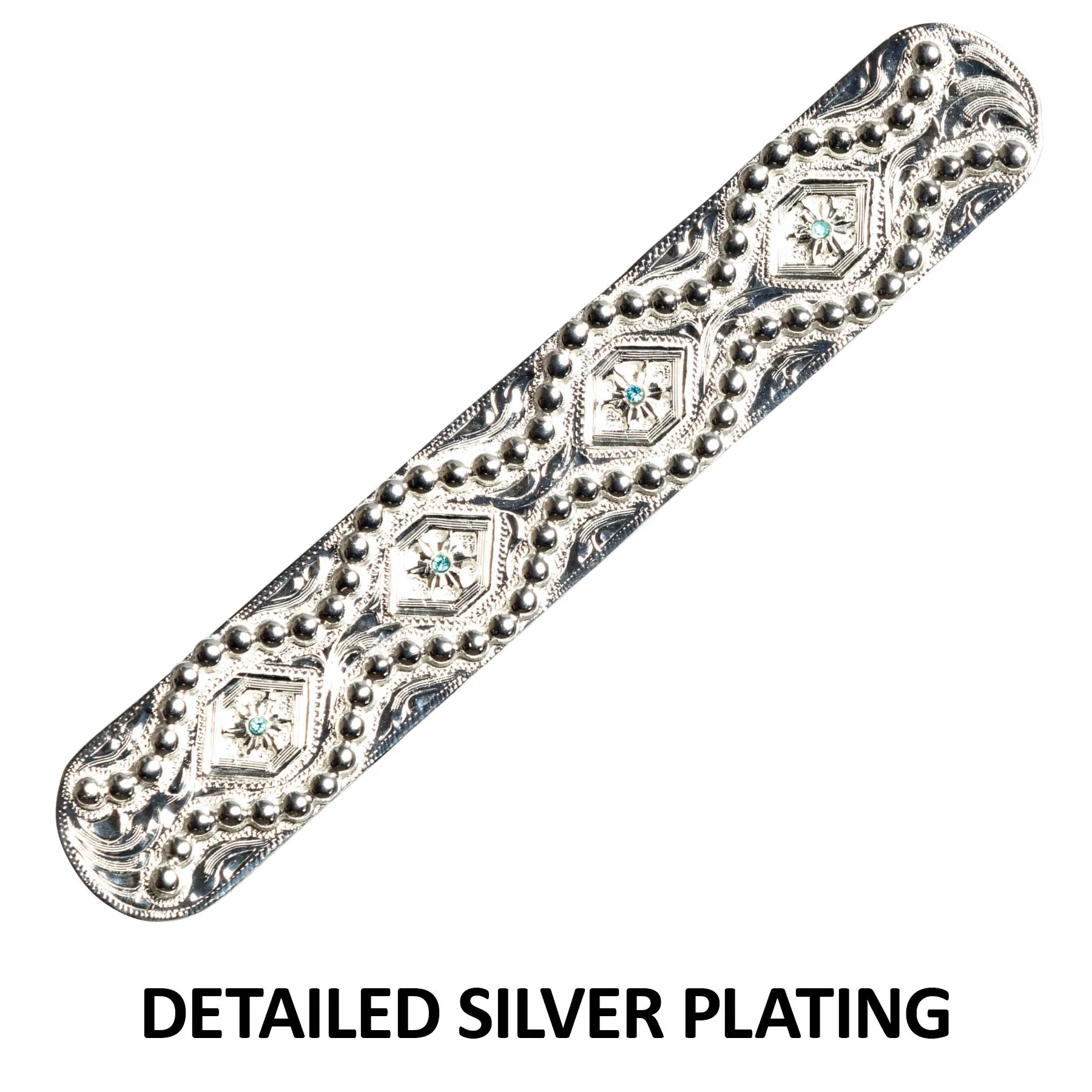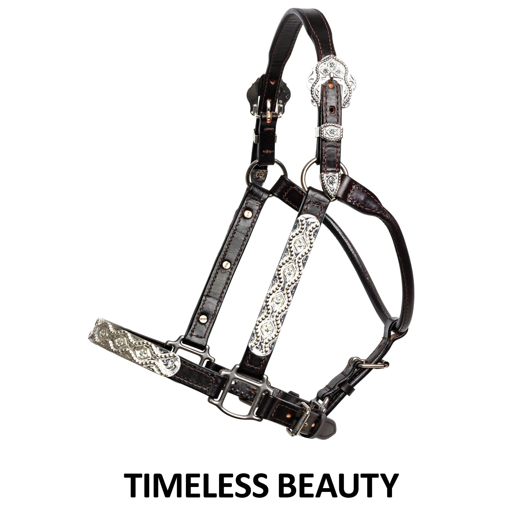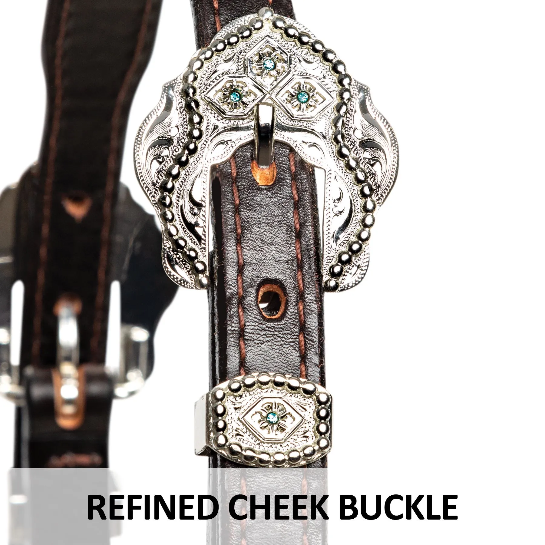 Creative design highlights a horse’s naturally beautiful features. Handcrafted from the finest premium heavyweight leather, hand rubbed and oiled for a supple finish and broke in feel. The engraved sterling silver plate trim in a timeless scroll pattern, and beautiful light blue crystal accents add just enough to catch your eye.