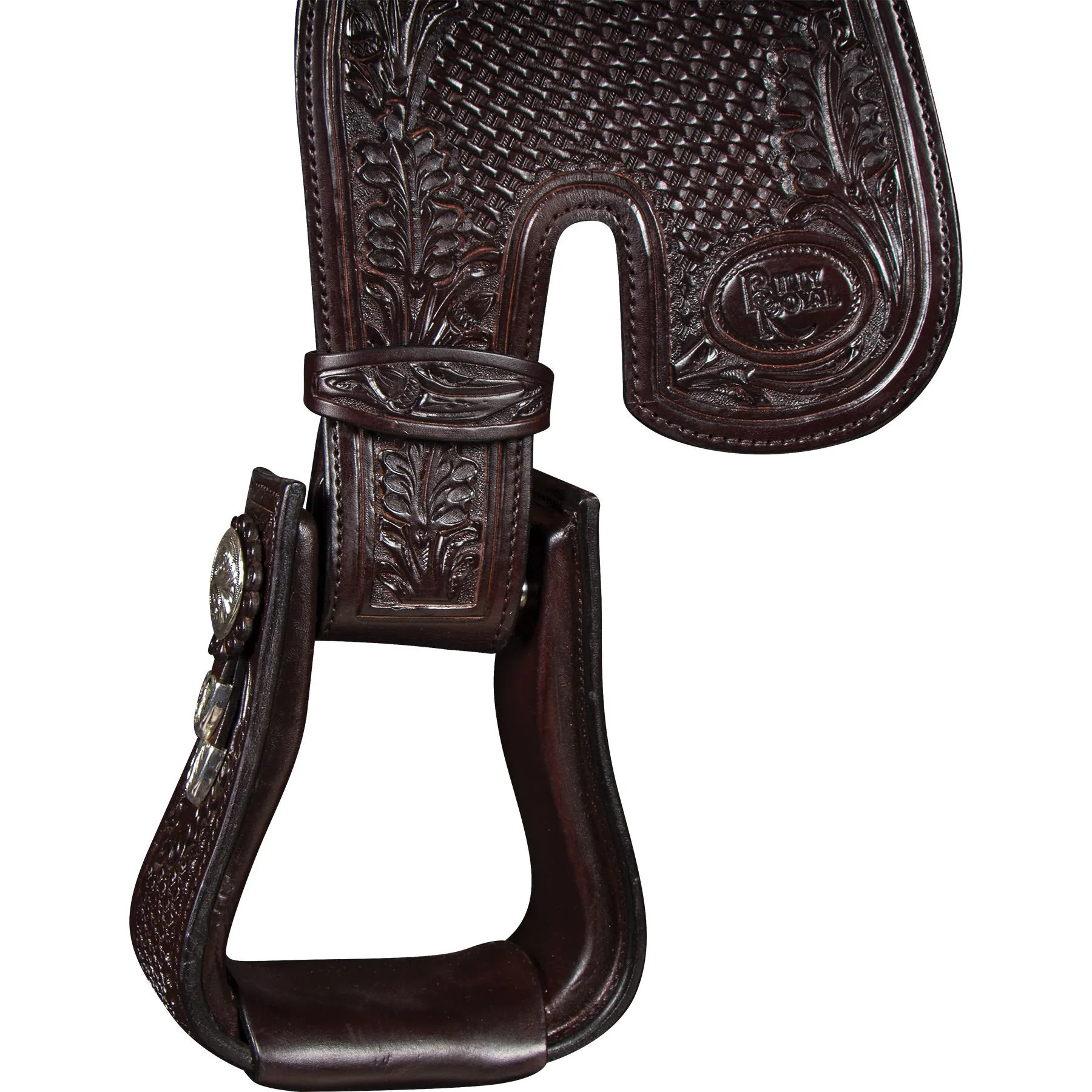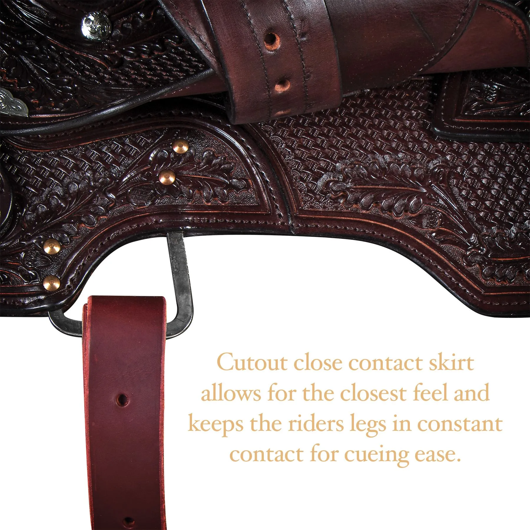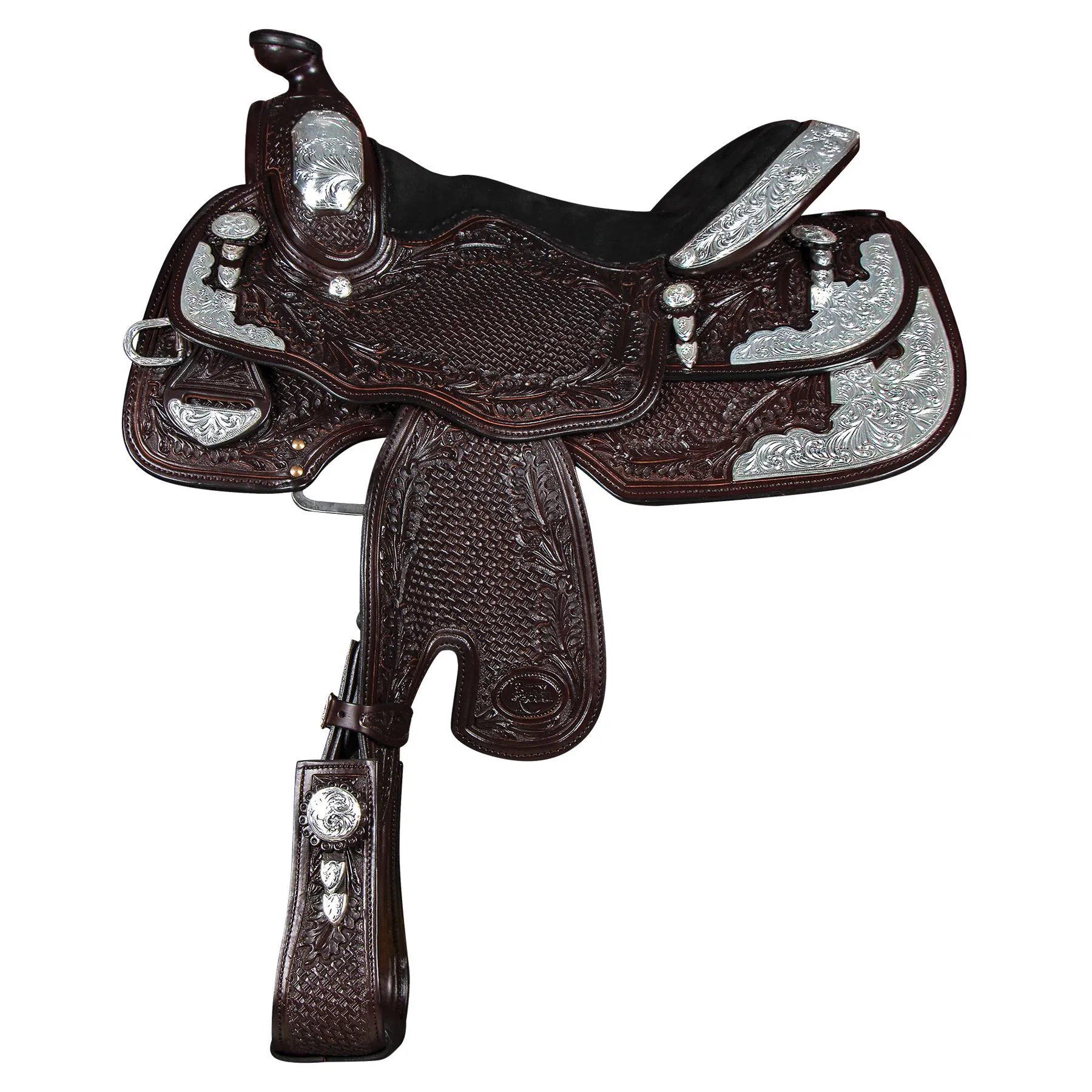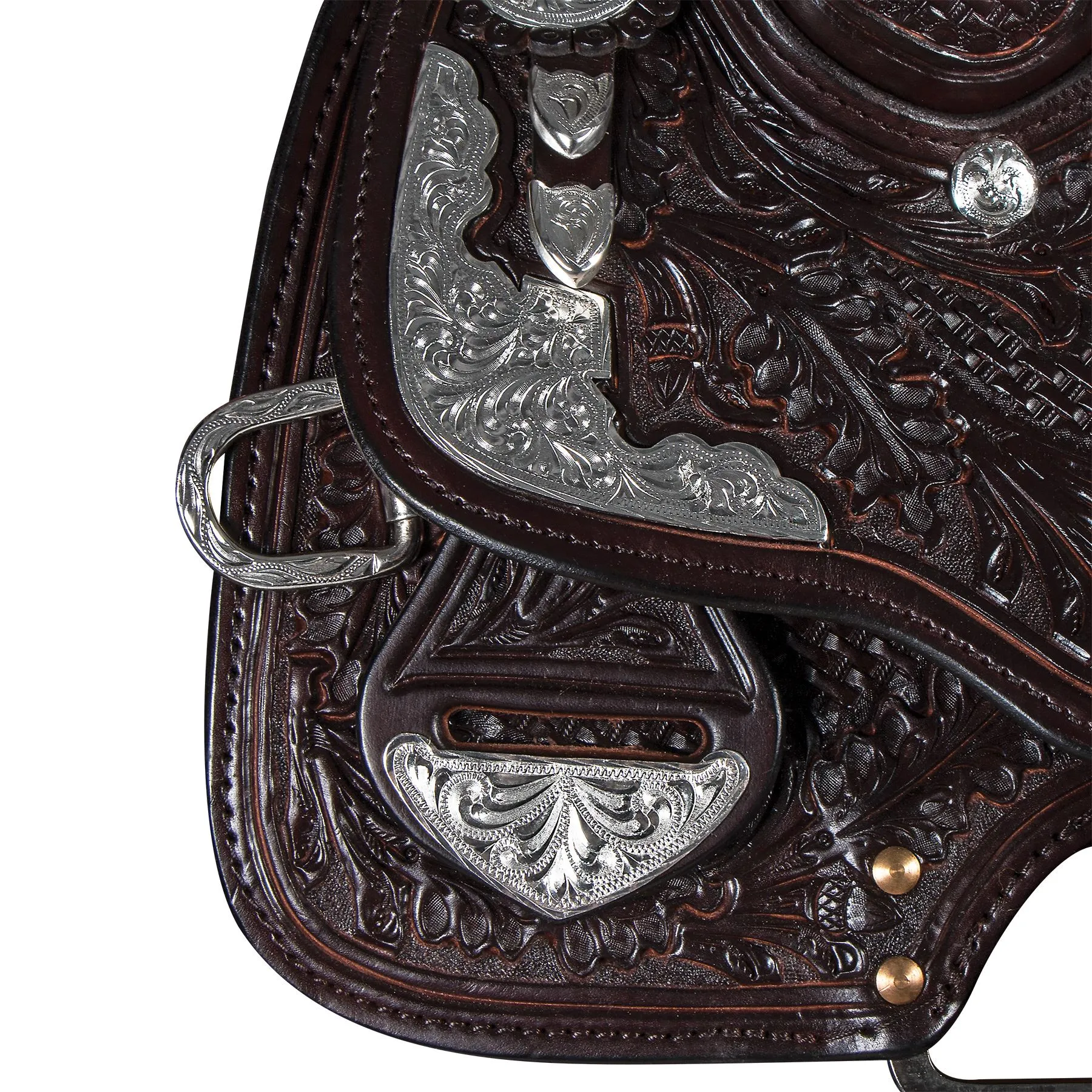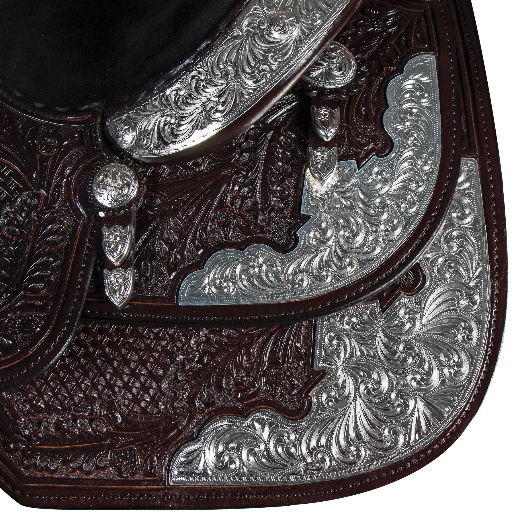 Meet the Congress II Youth Show Saddle, a perfect companion for young riders in QH or Open show-level events. This saddle ensures a natural and correct body position, focusing on balance and seat. Crafted with a custom-made wooden, rawhide-wrapped tree, it has a lifetime warranty and features an innovative fender design that allows easy stirrup adjustments. The saddle showcases a classic basket weave and oak leaf design, hand-tooled to perfection. The narrow, hand-shaped seat offers unsurpassed balance, while its custom trees are adapted to fit today’s horse conformations, from Arabians to Quarter Girses. It’s completed with a beautifully hand-engraved sterling silver plated trim in a classic scroll design, making this saddle truly distinctive.