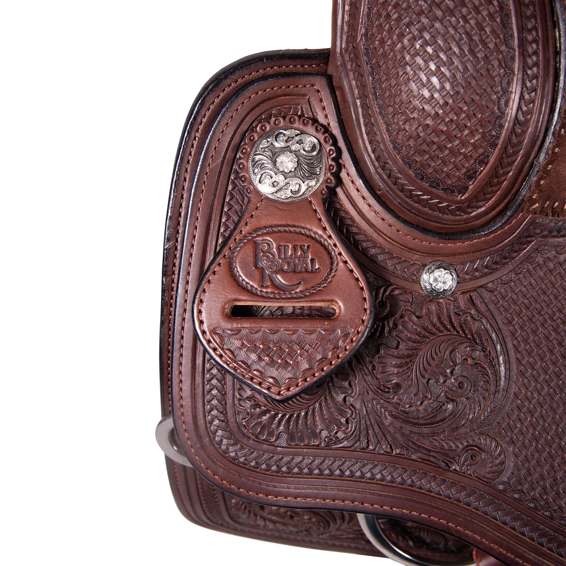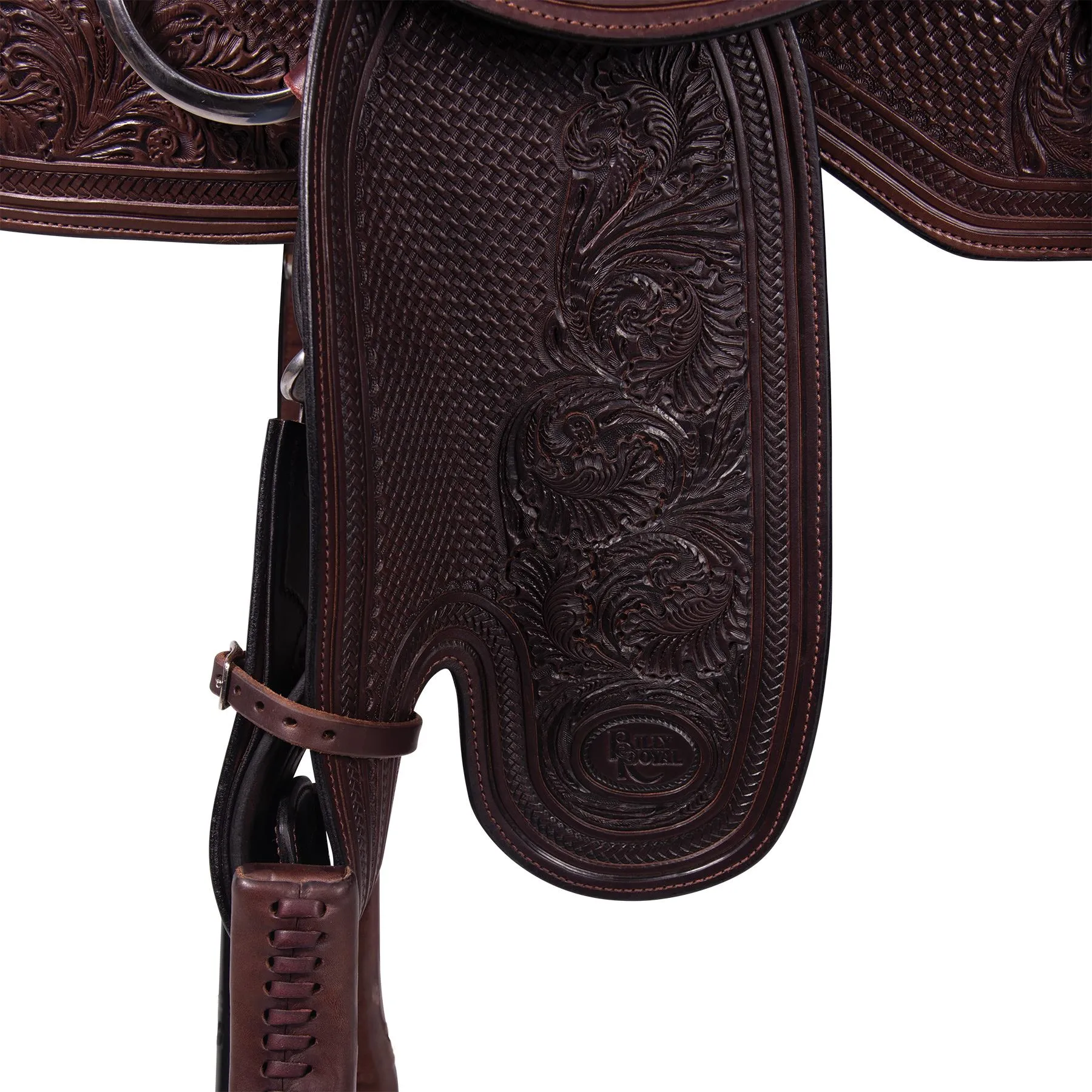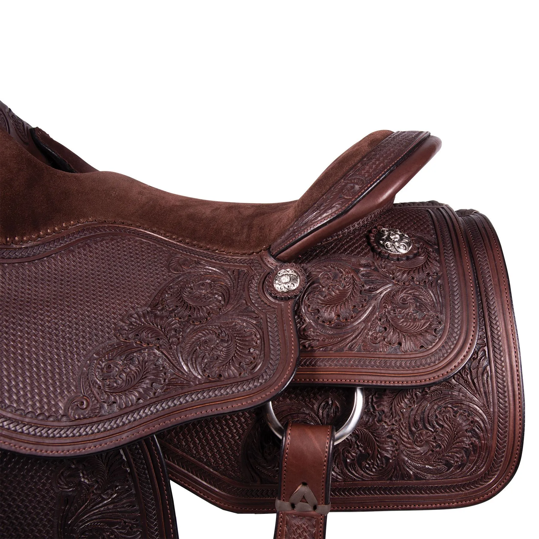 This western saddle is designed with modern conformations in mind. It features hand tooling, a comfortable and generously padded suede seat for a close contact feel, and all the necessary hardware. Crafted with the finest hand-selected hides, this saddle is built on our custom-made wooden trees, modified to fit a range of conformations from Arabians to Quarter Horses. The delicate tooled rope border, fine hand-tooled basket weave, and Entz tooling add a touch of elegance. This saddlee combines style, comfort, and functionality, making it an ideal choice for riders seeking quality and performance.