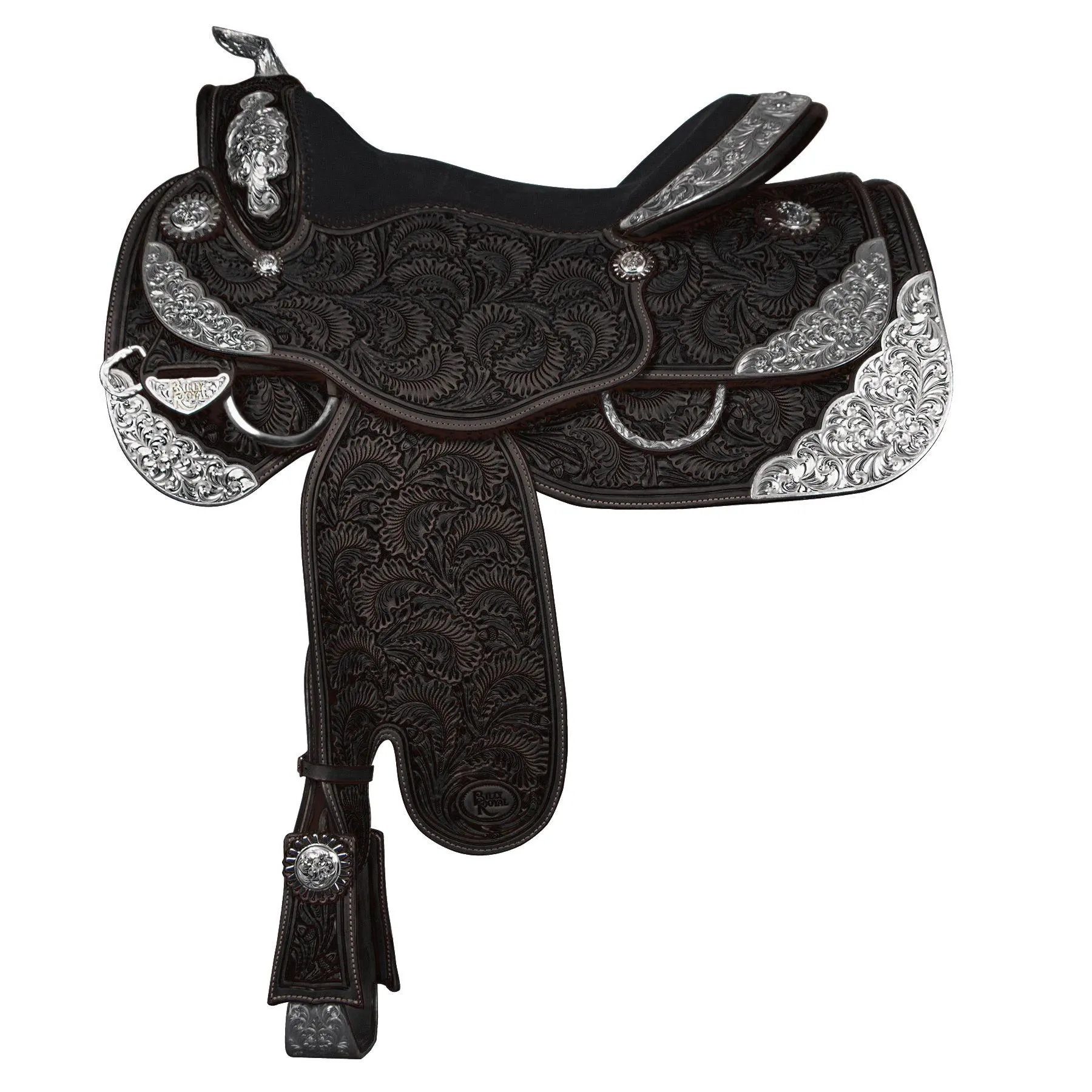 The Georgia Classic Western Show Saddle is an excellent demonstration of high-quality artistry and timeless style. This saddle is crafted from the finest hand-selected hides, meticulously tooled in an Oak leaf and acorn pattern, and complemented by beautifully hand-engraved sterling silver plate trim. Designed to fit today’s modern conformations, this saddle is built on custom-made wooden trees modified to fit various breeds with full horse bars. The saddle features a simpler silver design that still exudes plenty of show-ring appeal. It also boasts a super comfortable hand-padded and shaped suede seat for optimum riding comfort.