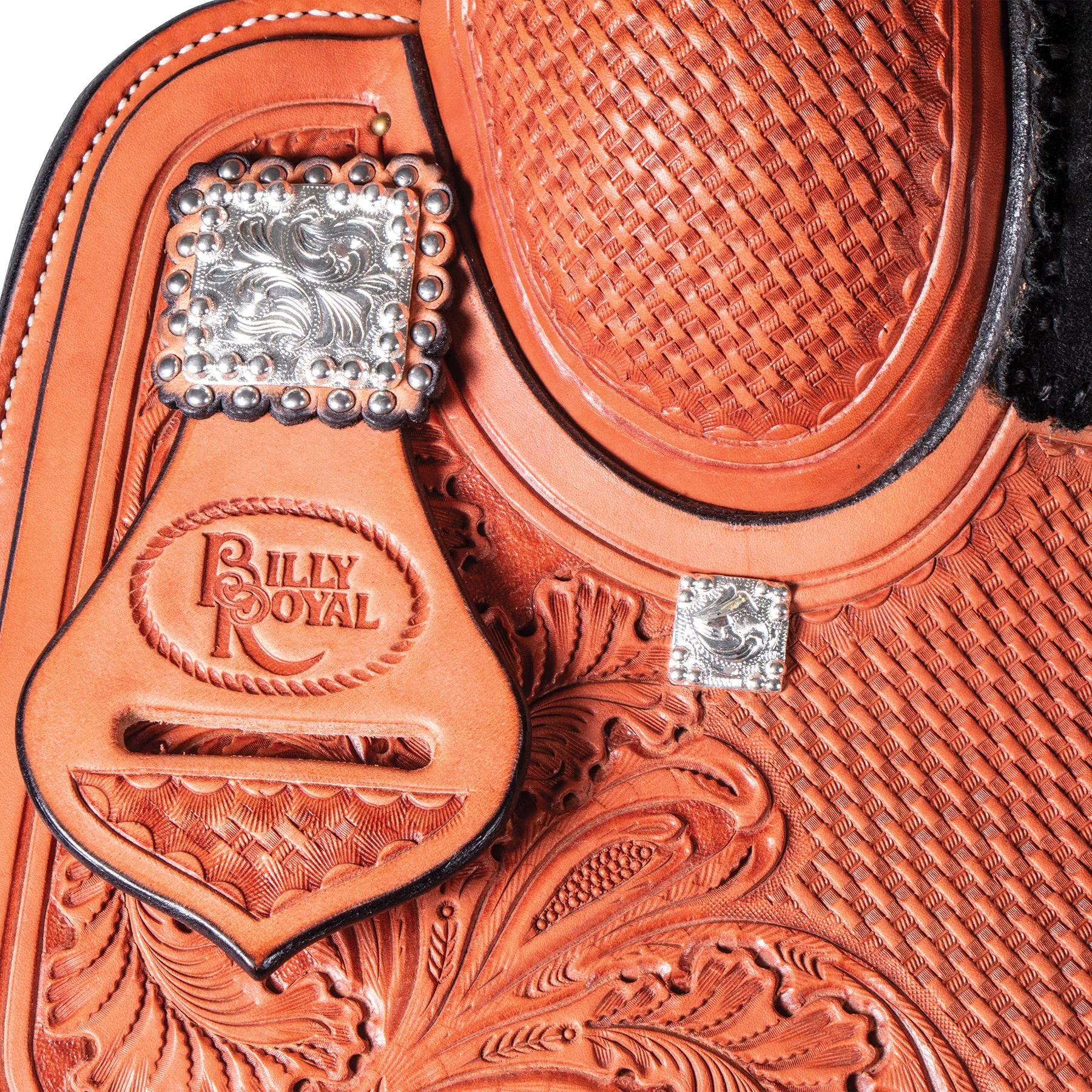 - Basketweave and Entz tooling, highlighted by hand-engraved sterling silver-plated conchos