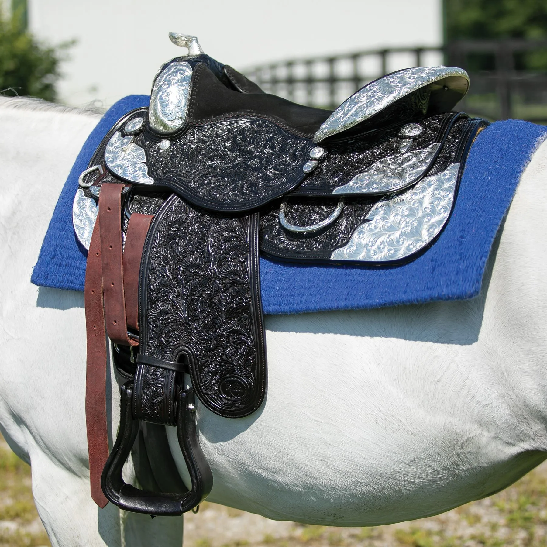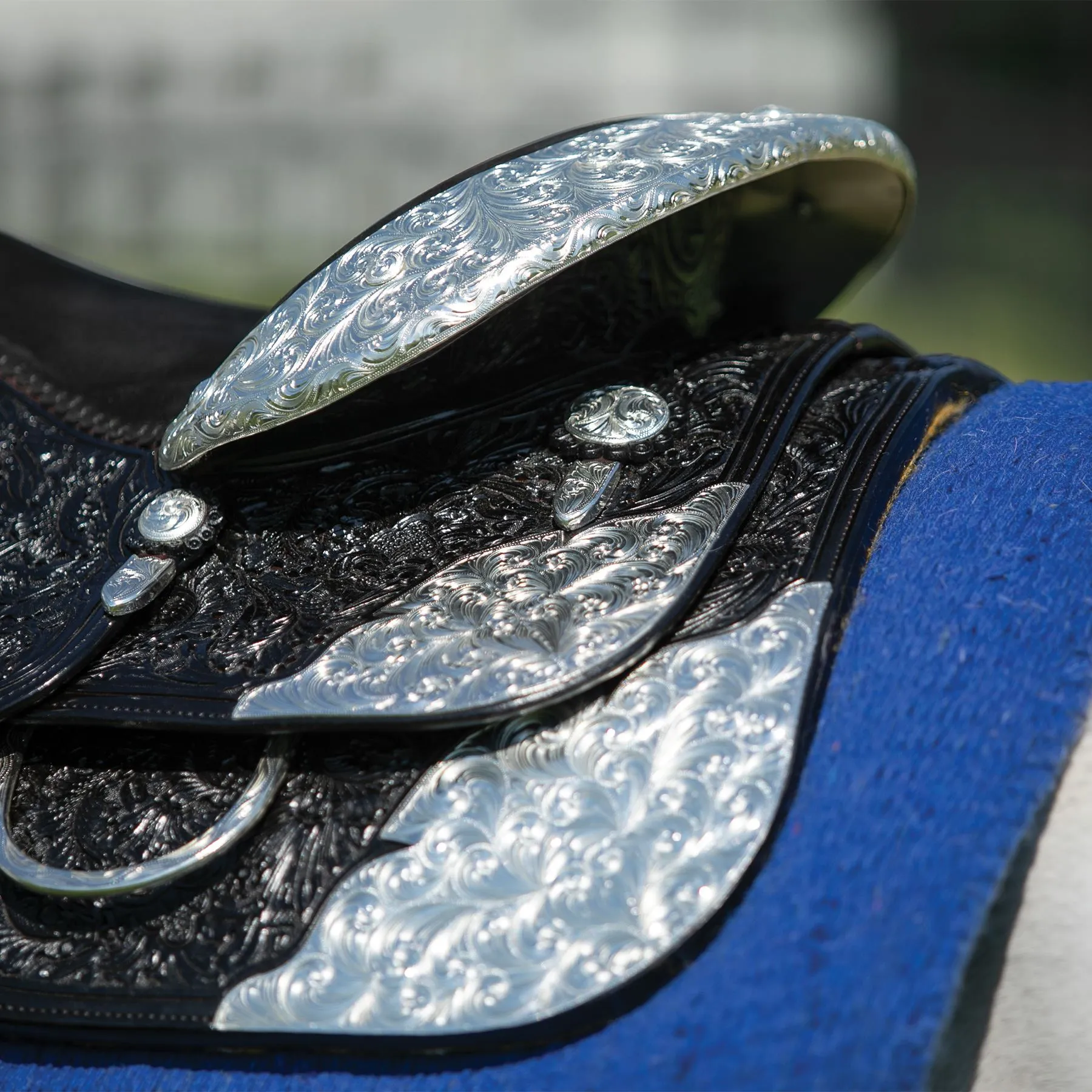 The Sedona Western Show Saddle is a well-crafted saddle ideal for shorter-backed or petite horses. This stunning saddle doesn’t compromise quality, comfort, or visual appeal. It is completely handmade and boasts a sterling silver plated pommel, horn, and oversized corner plates for a rich, elegant look. Its design ensures excellent rider balance over the back, significantly reducing leg and foot movement thanks to its close contact features. This saddle is made from carefully-chosen hides and guarantees high quality and a supple feel that can withstand years of use.