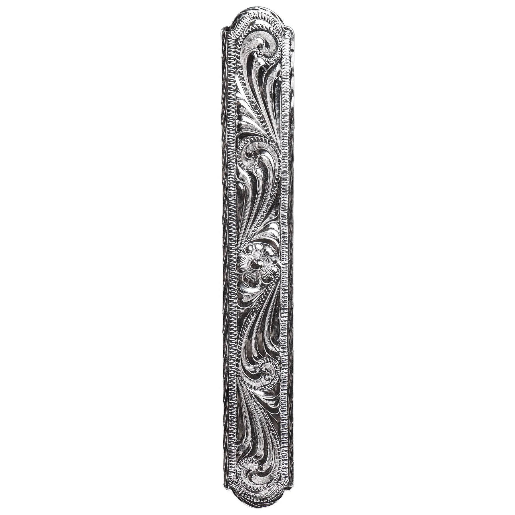 • Hand engraved sterling silver plate trim in a classic scroll pattern