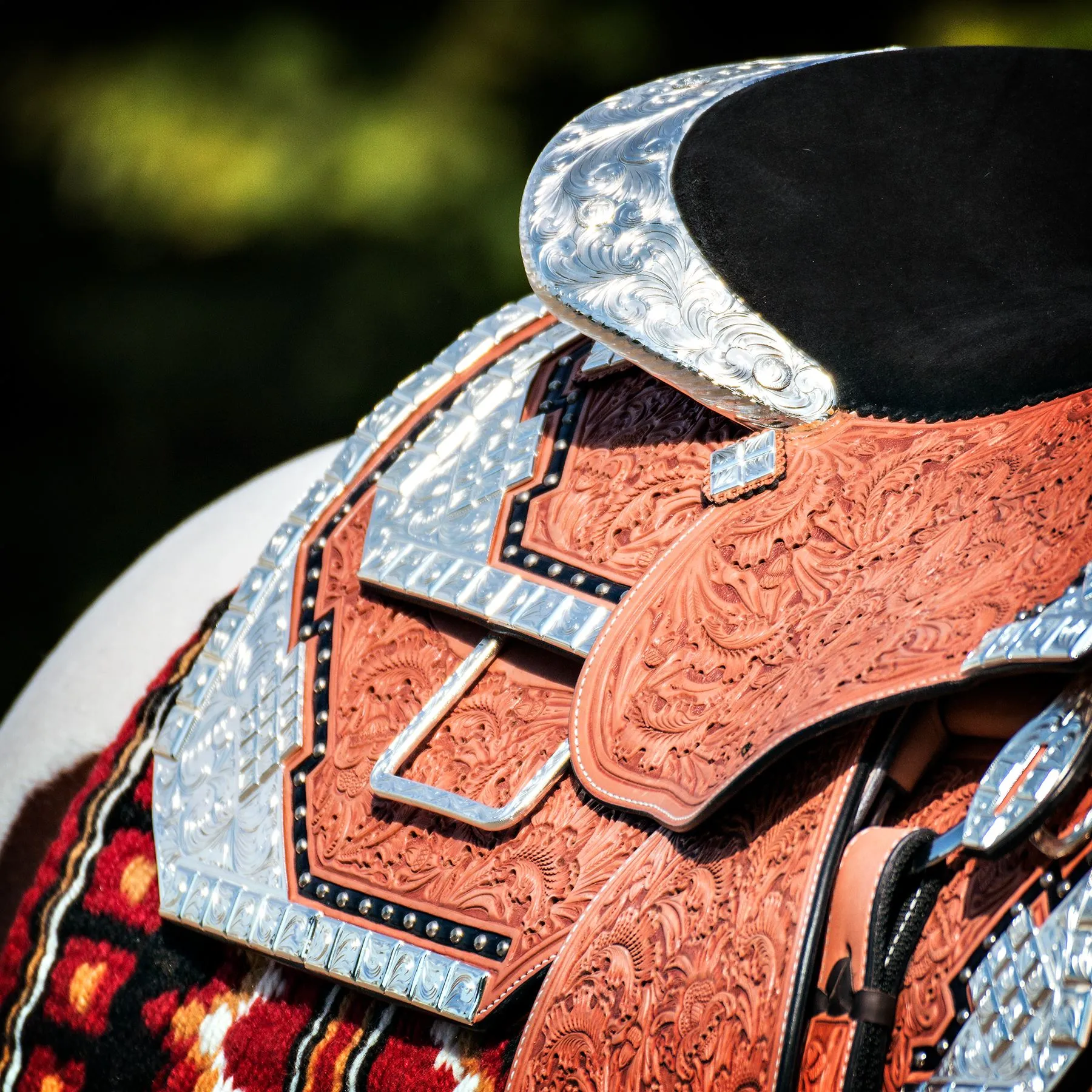 The Supreme Champion Western Show Saddle is a testament to quality and style, delivering an exceptional riding experience. This saddle is crafted from the finest hand-selected hides, meticulously tooled to perfection in the Entz pattern, and adorned with beautifully hand-engraved sterling silver plate trim. Designed to fit today’s modern conformations, this saddle is built on custom-made wooden trees modified to fit a range of breeds from Arabians to Quarter Horses with full horse bars. The unique trim features a classic scroll pattern in a small detailed square design, outlined with black leather with silver dots�giving life to the silver. This saddle also boasts a trendy diagonal-cut skirt and silver horn, adding to its appeal.
