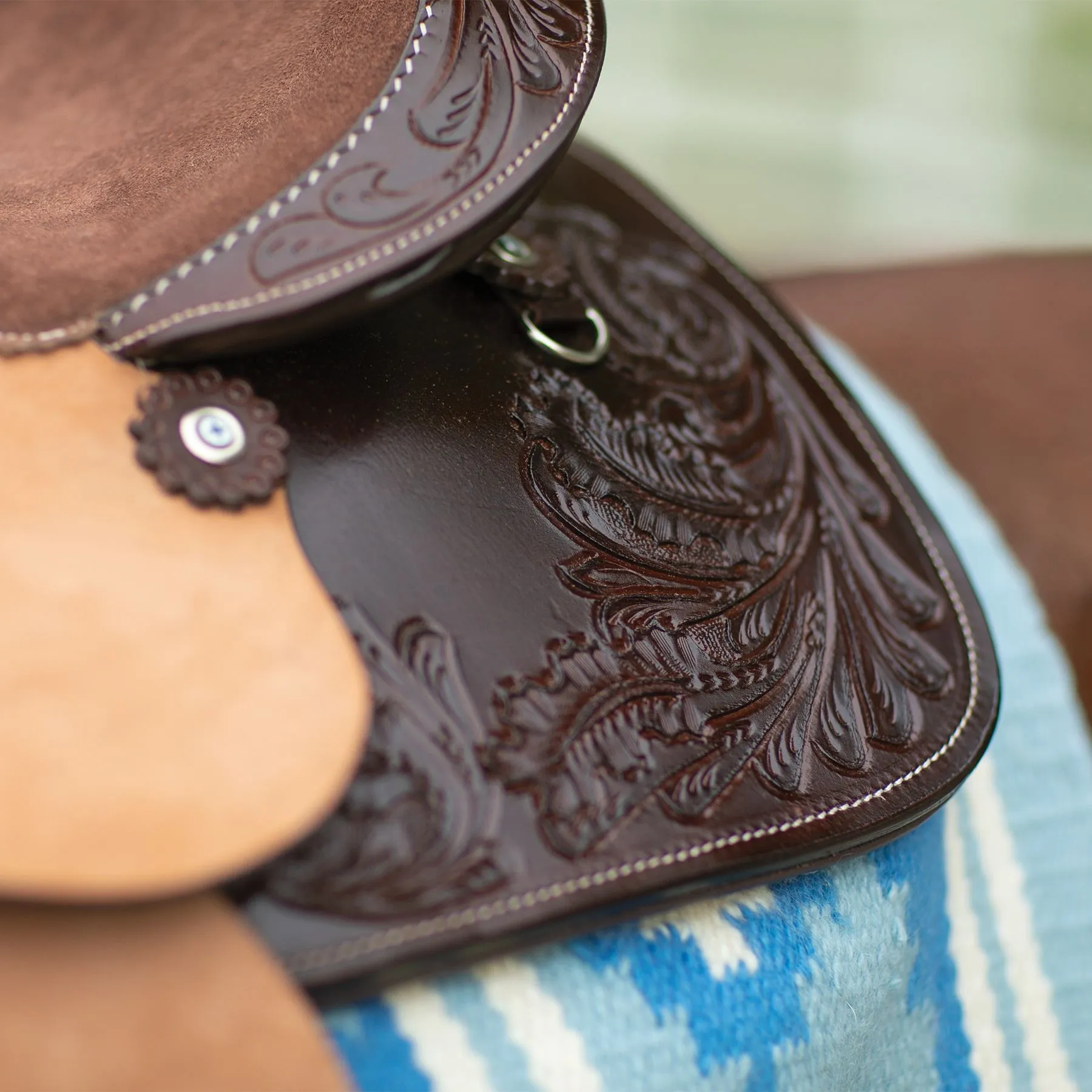 The Double S Lil’ Buckaroo Youth Saddle is the perfect starter saddle, designed with young riders in mind. This saddle is a beautiful blend of premium quality and exceptional design, offering unbeatable value. Handcrafted from premium leather, it has a semi Quarter Horse bar that accommodates most horses. Its beautiful floral tooled leather skirt, pommel, cantle, and stirrups stand out. The saddle also features a roughout seat jockey and fenders, providing extra ‘stick’ for a secure ride. It ensures longevity and is built on a lightweight fiberglass tree with a 5-year warranty. The Double S Lil’ Buckaroo Youth Saddle is not just a saddle but a stepping stone to a young rider’s journey.