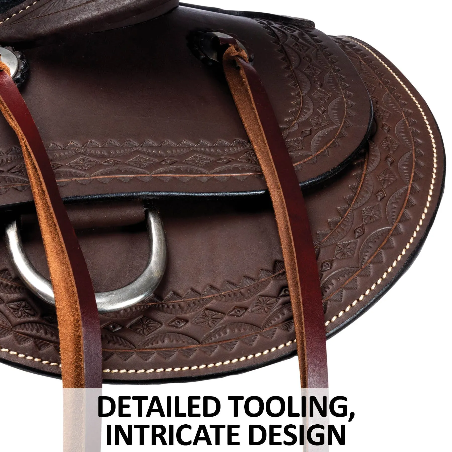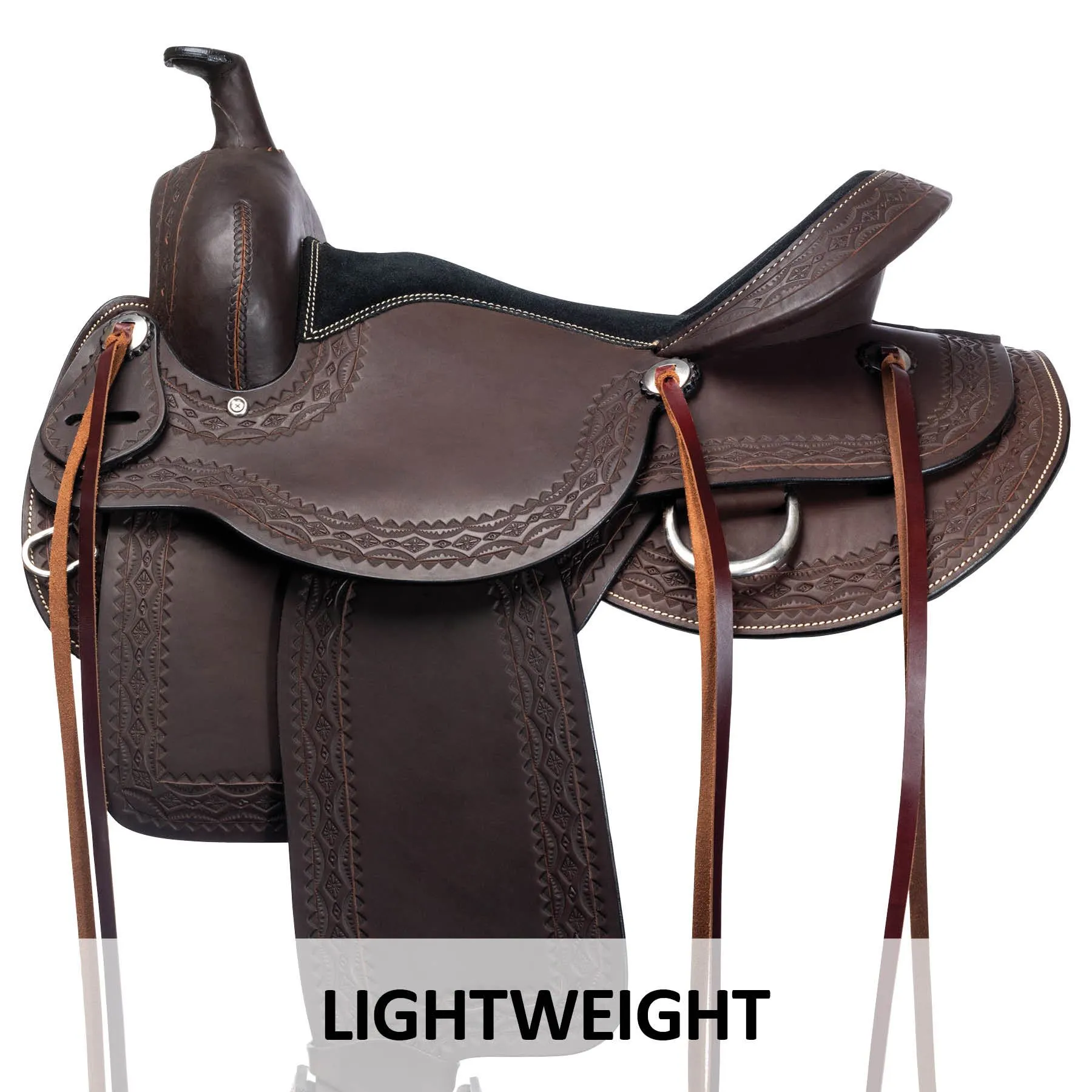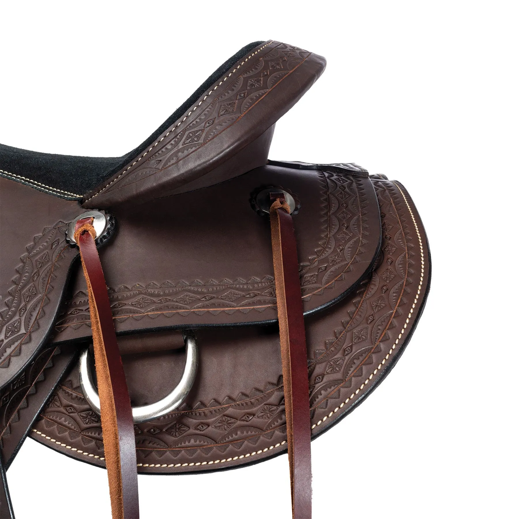 The Double S Oiled Trail Saddle is a durable all-leather western saddle with an attractive leaf pattern that is meticulously hand-tooled. It has a generously padded suede seat for all-day comfort on the trail and knee guards that cover the cinch hardware. The saddle’s fiberglass tree fits modern horses well, making it comfortable for regular use or long trail rides. This saddle is practical and low-maintenance, and its unique features make it a great choice.