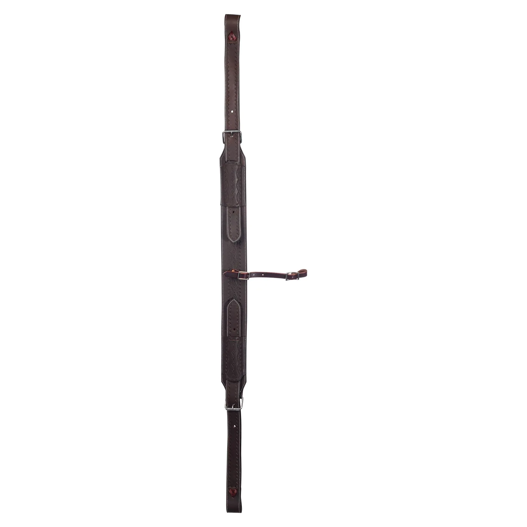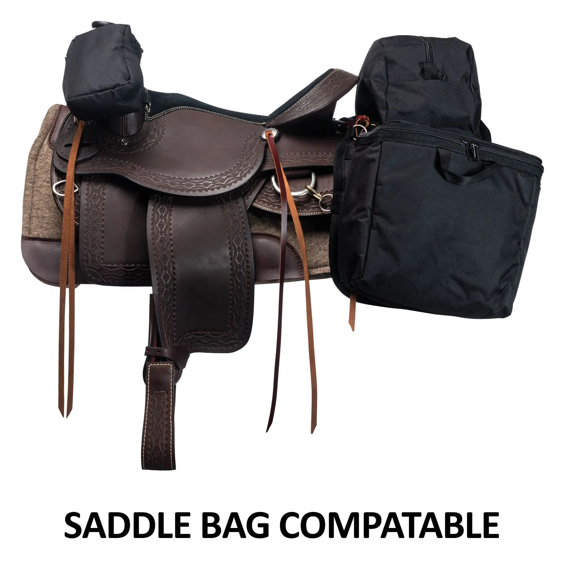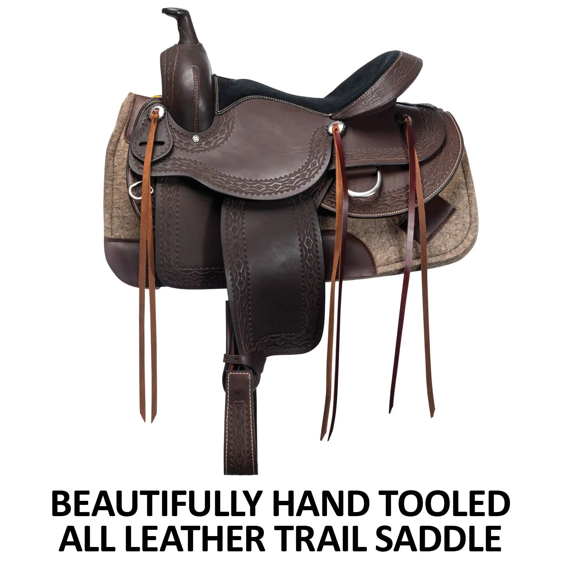 The Double S Oiled Trail Saddle is a durable all-leather western saddle with an attractive leaf pattern that is meticulously hand-tooled. It has a generously padded suede seat for all-day comfort on the trail and knee guards that cover the cinch hardware. The saddle’s fiberglass tree fits modern horses well, making it comfortable for regular use or long trail rides. This saddle is practical and low-maintenance, and its unique features make it a great choice.