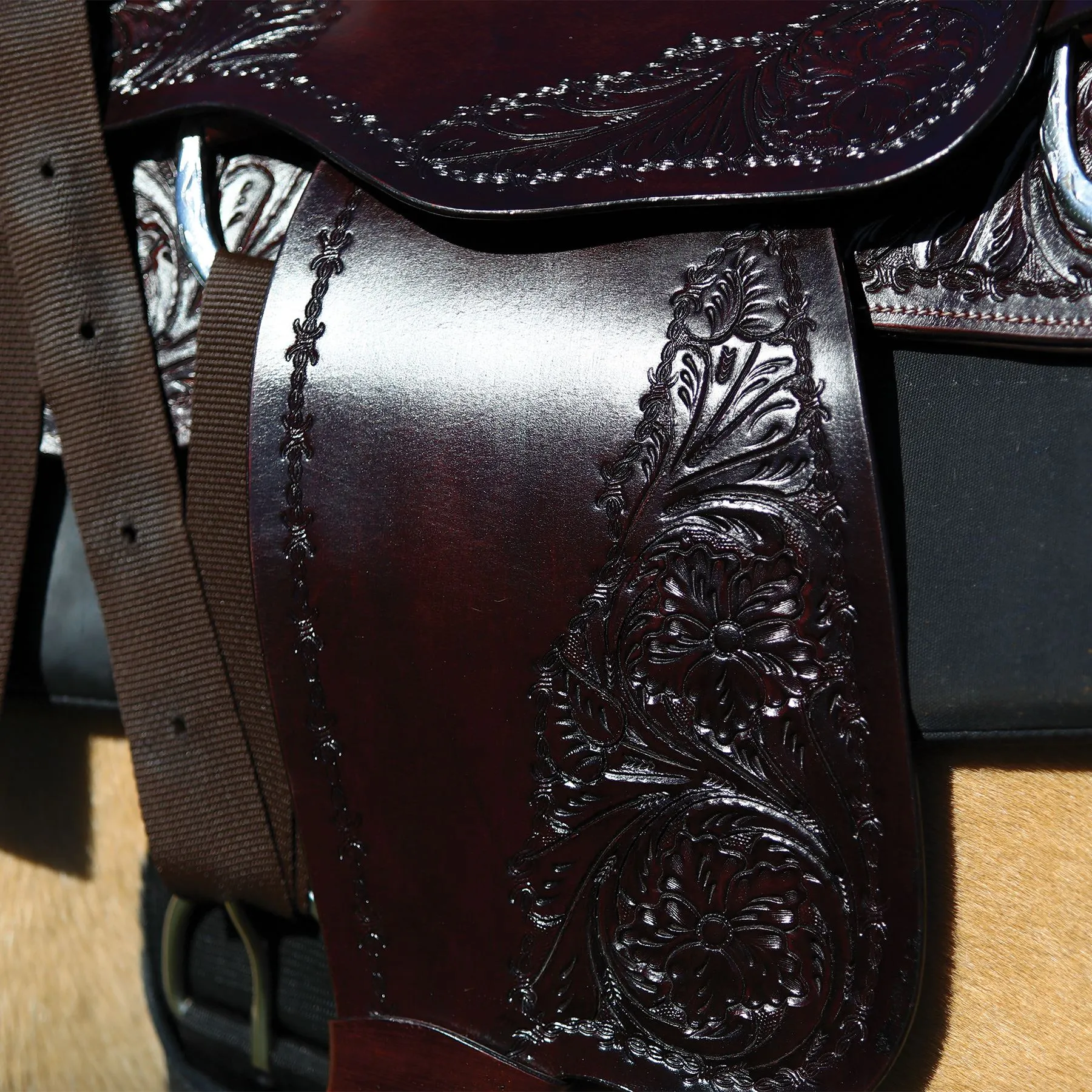 - Attractive floral tooling pattern with barbed wire border