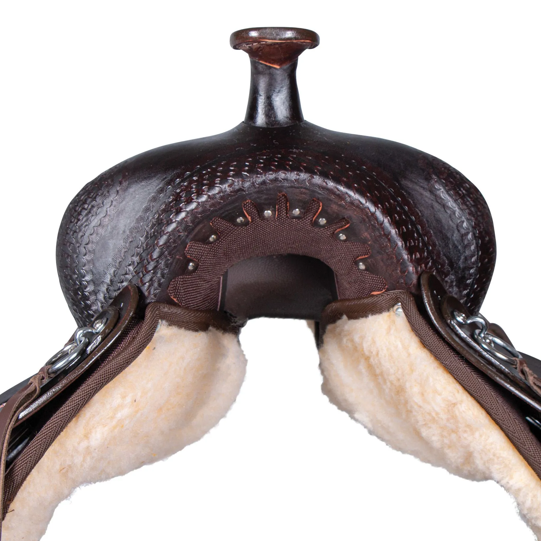 The Double S Open Range Saddle is a beautifully tooled saddle perfect for show, work, or trail. This attractive saddle is built on a lightweight fiberglass tree and has a five-year warranty. Designed with full-quarter horse bars, it can accommodate today’s modern conformations. The saddle features a beautiful floral tooling pattern with a barbed wire border, smooth leather fenders, skirt jockey, and a generously padded seat, making it both comfortable and stylish.