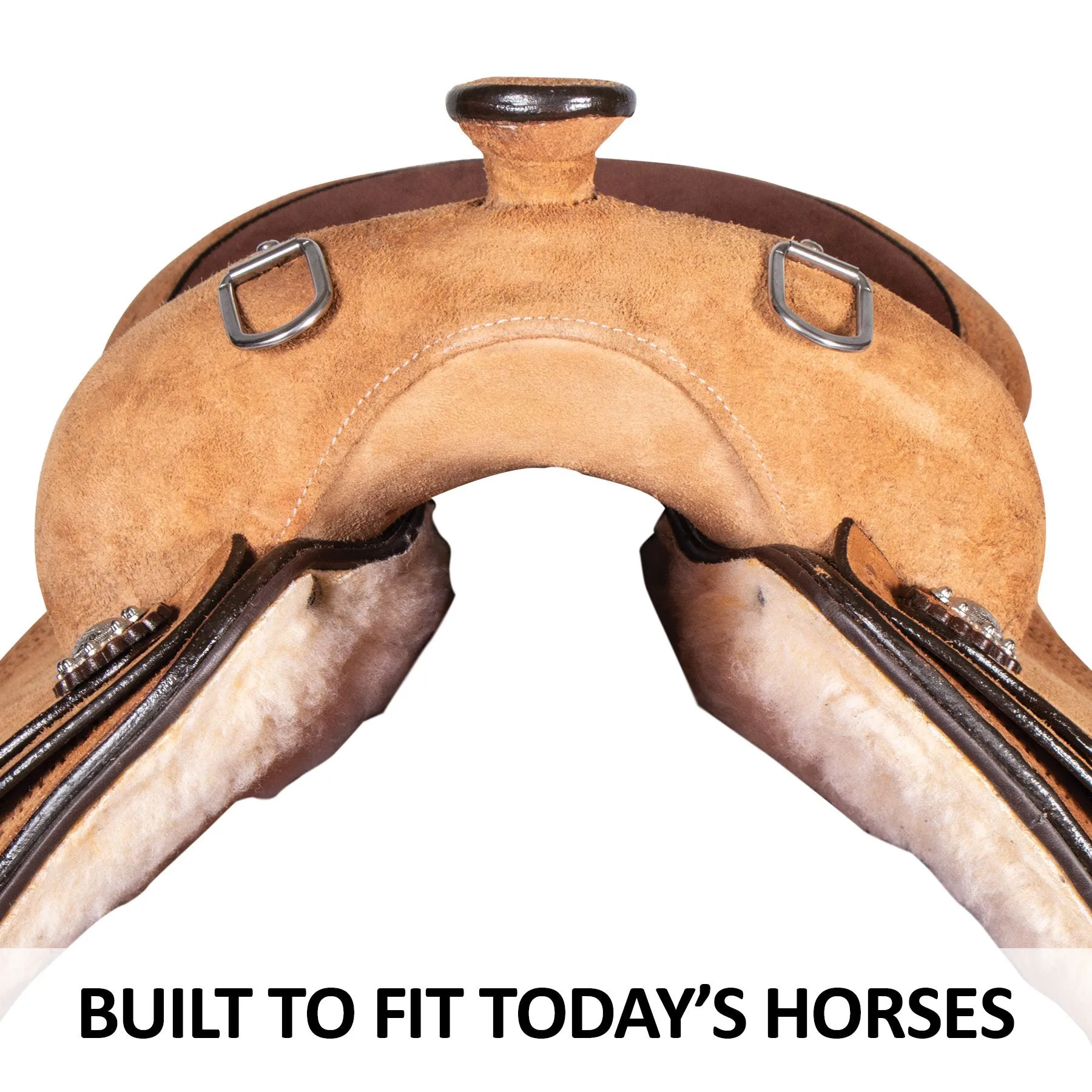 The Double S Running Roughout Work Saddle is a perfect blend of superior quality and affordability. This saddle is designed with Semi-Quarter Horse bars to accommodate modern horse conformations. It features a total roughout design that provides added ‘stick’ and security for riders during training or ranch work. This saddle boasts a lightweight injected-molded plastic tree with a 5-year warranty.