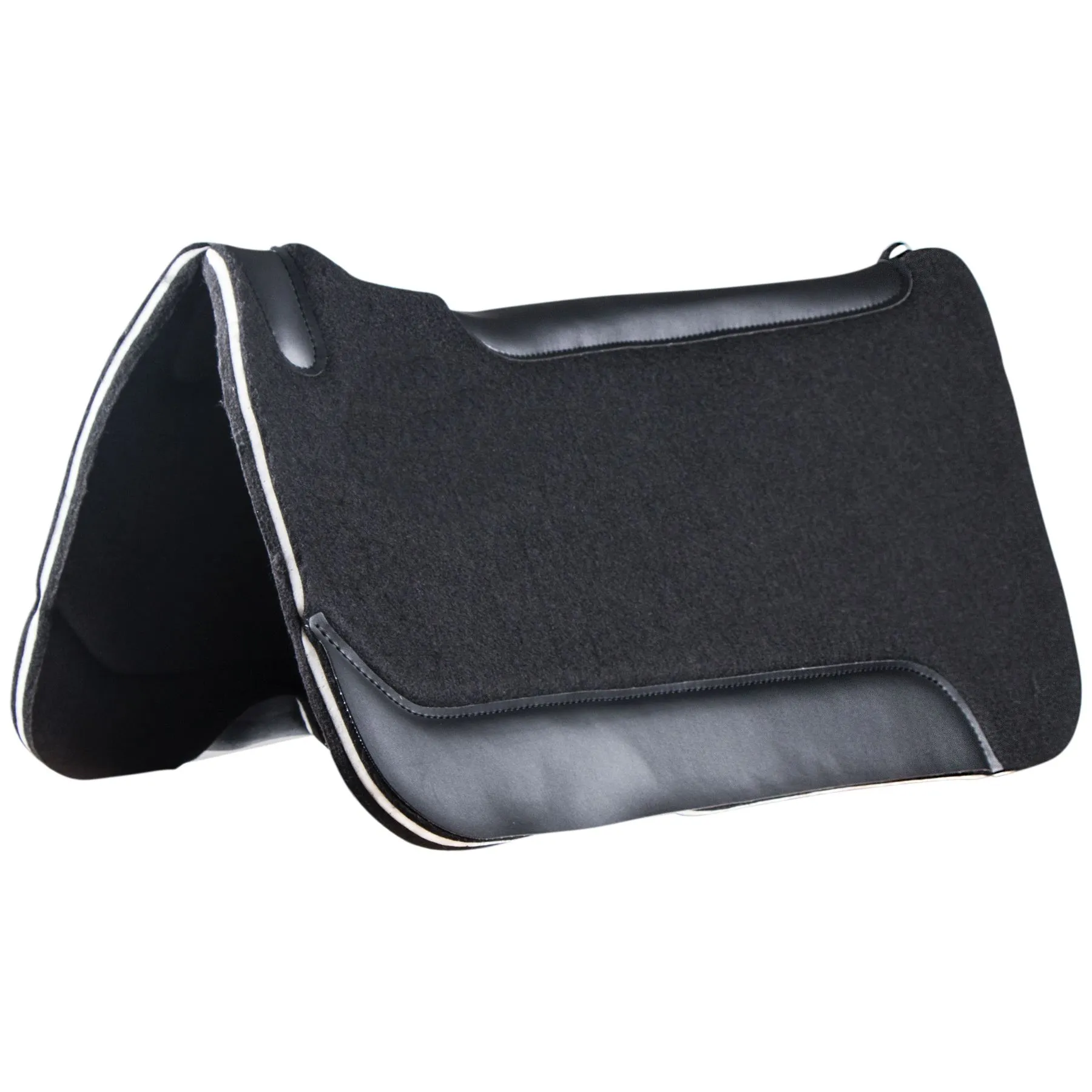 The Dura-Tech® Contour Memory Foam Western Saddle Pad is a high-quality pad that provides substantial cushioning and alleviates soreness. This 1″ thick pad features a 1/4″ memory foam core that absorbs shock and conforms to your horse’s back, dispersing pressure evenly across the back. The dense wool felt surrounding the foam core wicks moisture away from the horse’s body, keeping the back cool. The contoured design with a wither cutout relieves pressure on the spine and ensures a better fit. Extended-wear leathers resist wear and tear in high-stress areas, while the girth cutout beneath the wear leathers provides a more secure fit.
