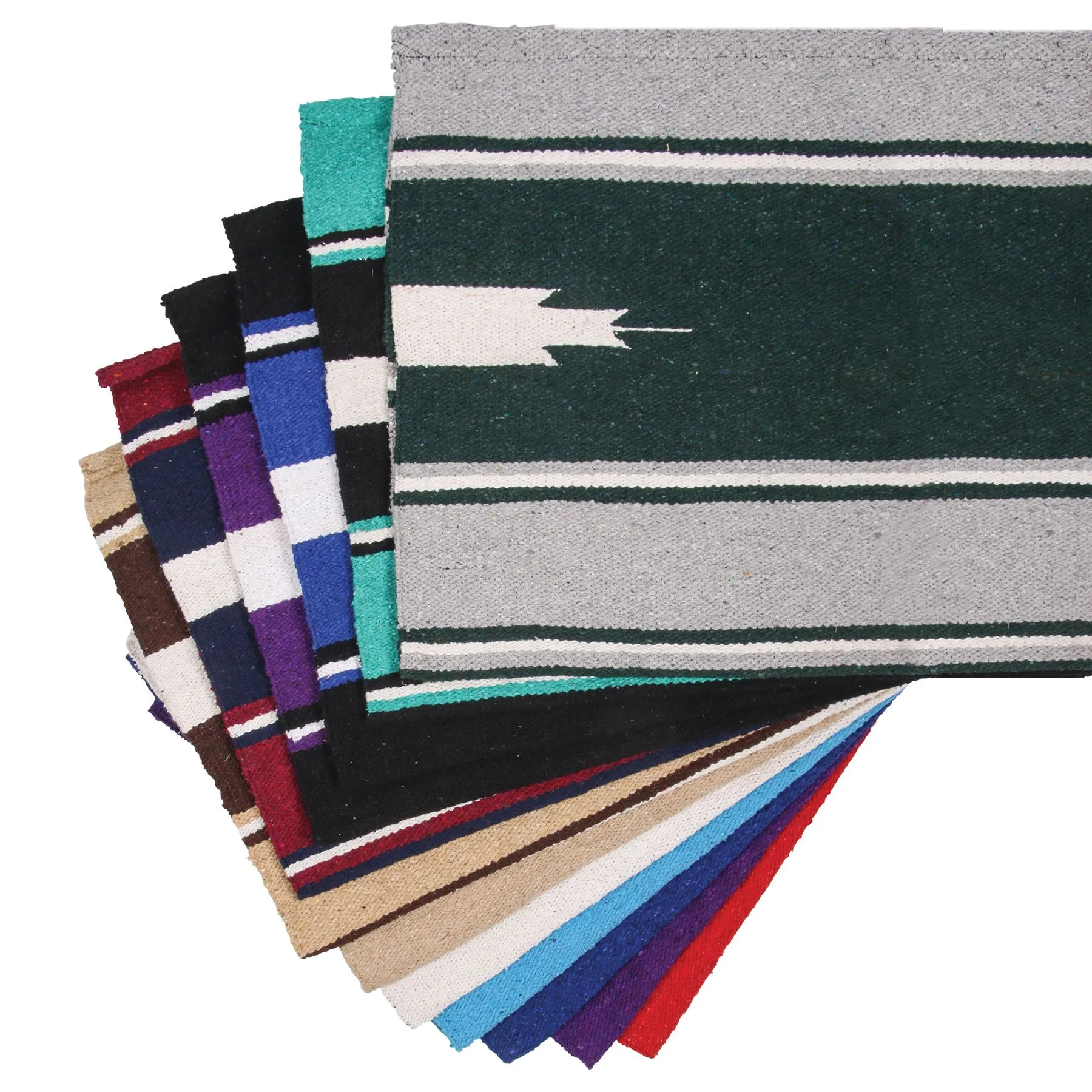 This Navajo Western Saddle Blanket is a lightweight choice for everyday riding or the show ring. The colorful acrylic and cotton blend is perfect for using over a protective pad, and it’s thin enough not to add bulk when used with another pad or blanket, so you can use it as a liner to keep your show pads clean from dirt and sweat. Available in solid or striped option that features a Navajo design.