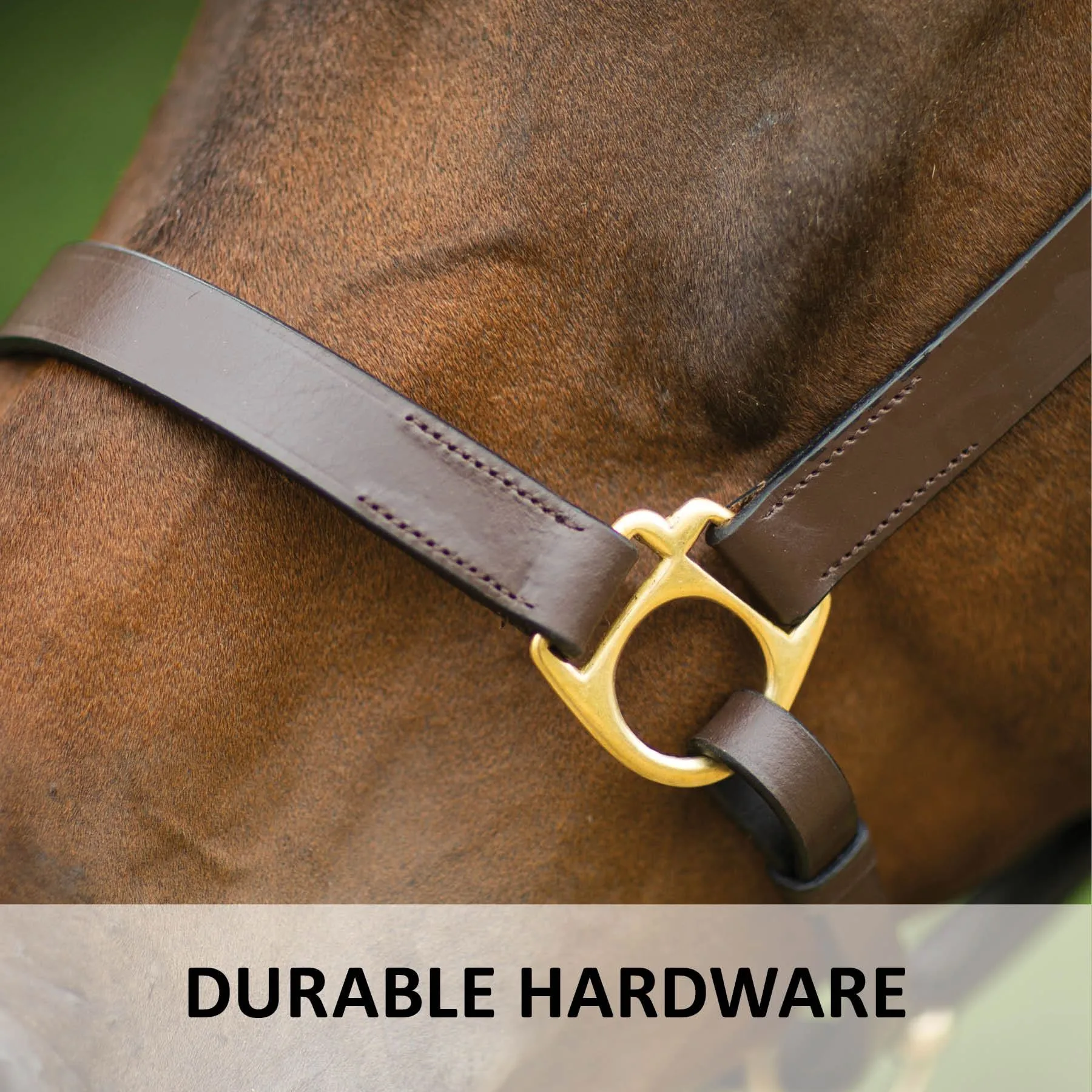 This 1″ single ply harness leather halter is reinforced at each ring, is fully adjustable and has solid brass hardware.