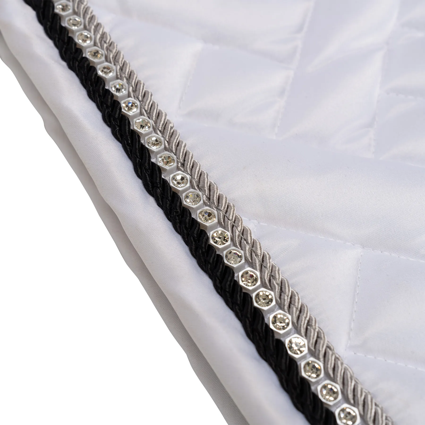 - Braided trim complemented by a dazzling rhinestone border